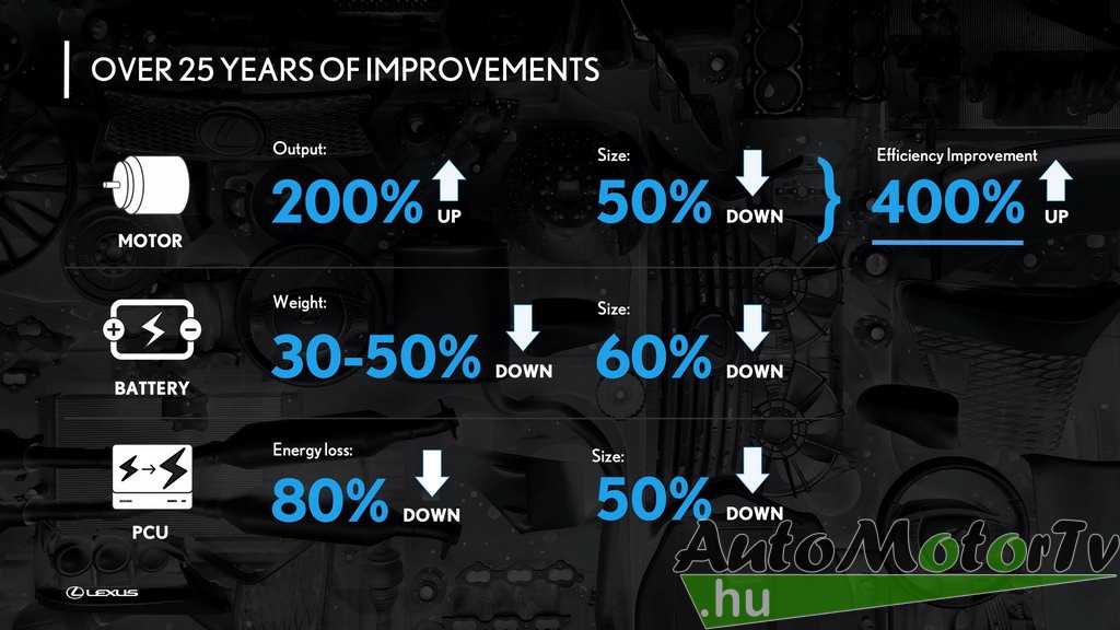 Az RX 400h bevezetése óta eltelt időben valóságos forradalom zajlott le a motorháztető alatt. A technológia már nem csak a márka drága, kiemelt járműveiben érhető el, hiszen a Lexus negyedik generációs öntöltő hibrid autói, az UX 250h és az ES 300h is kiemelkedő üzemanyag-hatékonysággal és alacsony károsanyag-kibocsátással futnak, miközben a korábbinál jóval nagyobb távolságot tesznek meg tisztán elektromos üzemmódban. Mindeközben a teljesítmény, a reszponzív működés és a vezetési élmény is jóval magasabb szintre lépett. Ennek a folyamatos fejlődésnek az adja az alapját, hogy a Lexus szakemberei egyre kompaktabb és kifinomultabb részegységeket alkottak a jobb teljesítmény érdekében. Az elmúlt 25 évben a Lexus és a Toyota több mint 24.000, az öntöltő hibridekhez és az EV technológiához kapcsolódó szabadalmat jegyzett be, vagyis többet, mint bármelyik másik autógyártó a világon. E vezető szerep kifejezéseként 2018-ban a Toyota bejelentette, hogy ingyen hozzáférhetővé teszi más gyártók számára is a hibrid rendszerekhez és elektromos hajtási technológiákhoz fűződő szabadalmait.