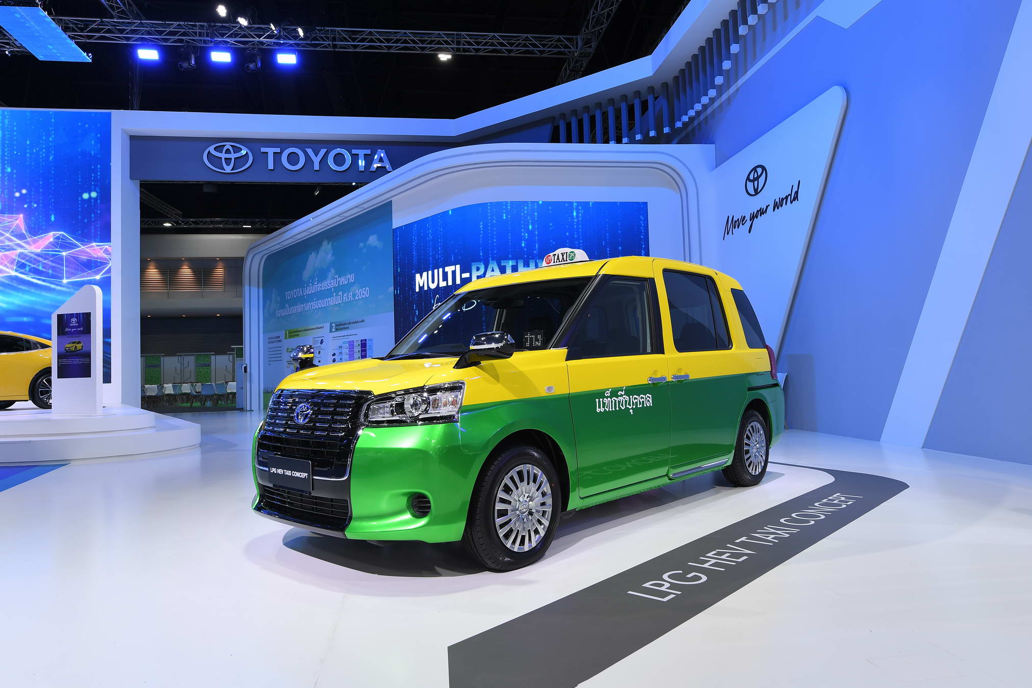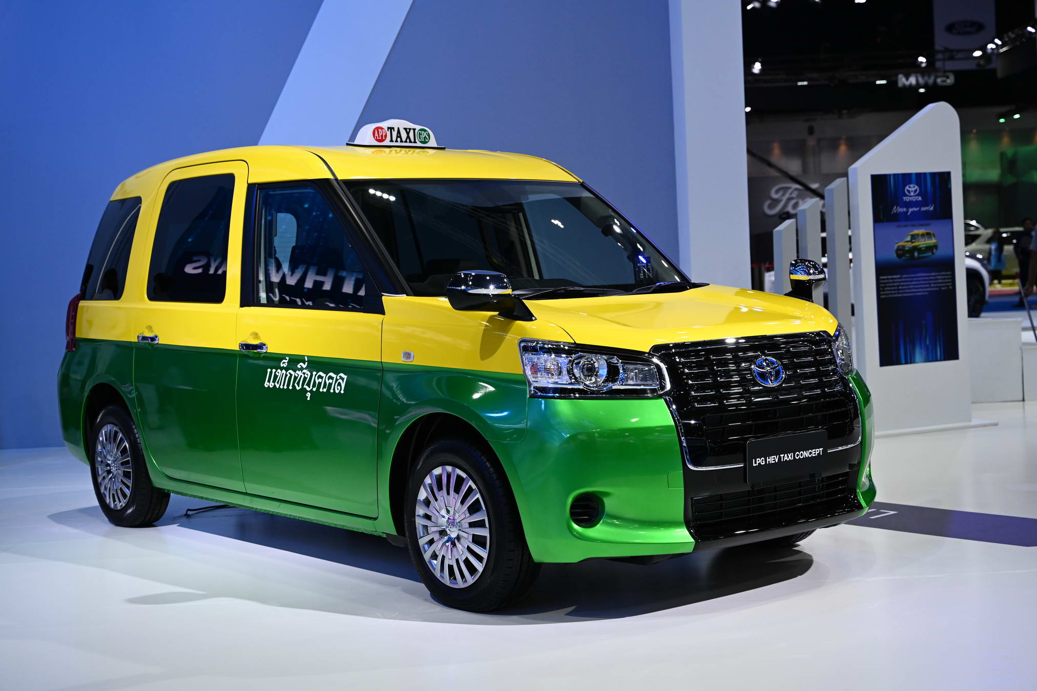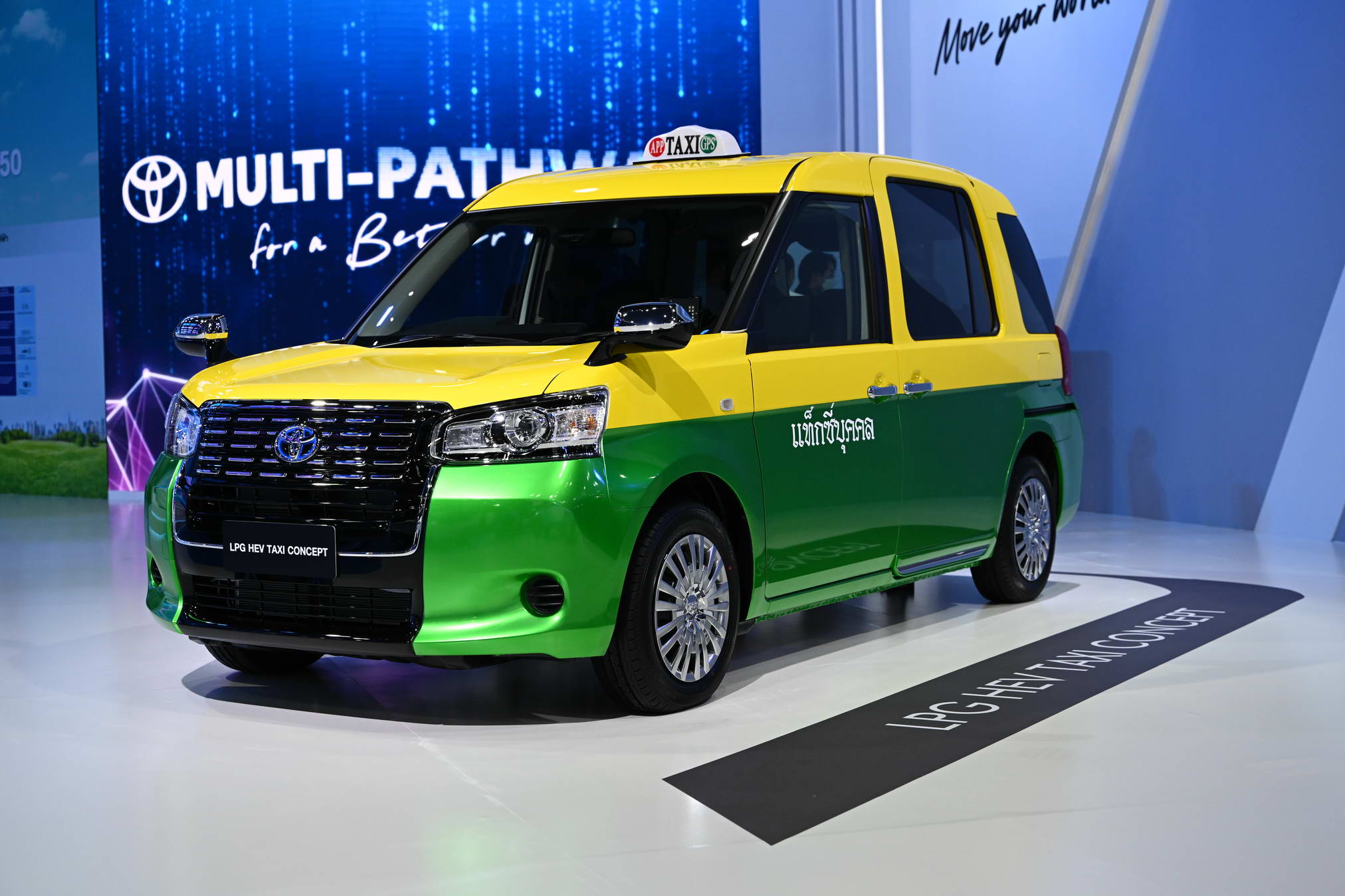 The LPG HEV Taxi Concept is a vehicle that has been designed specifically for use as a taxi. The concept car showcased at this event features a unique yellow-green color scheme, giving it a distinct identity for Thailand. The vehicle has a high roof and is equipped with a large electric sliding door. The cabin is spacious and designed with a low flat floor to facilitate the use of ramps for wheelchairs. This feature makes it convenient for all passengers, especially the elderly and children, to enter and exit the cabin easily. The LPG HEV Taxi Concept has been created with a focus on comfort and minimizing driver fatigue. It also emphasizes environmentally-friendly power, utilizing a hybrid engine that combines electric power with LPG. More notably, the vehicle is equipped with Toyota Safety Sense, providing peace of mind to everyone on board throughout the journey.